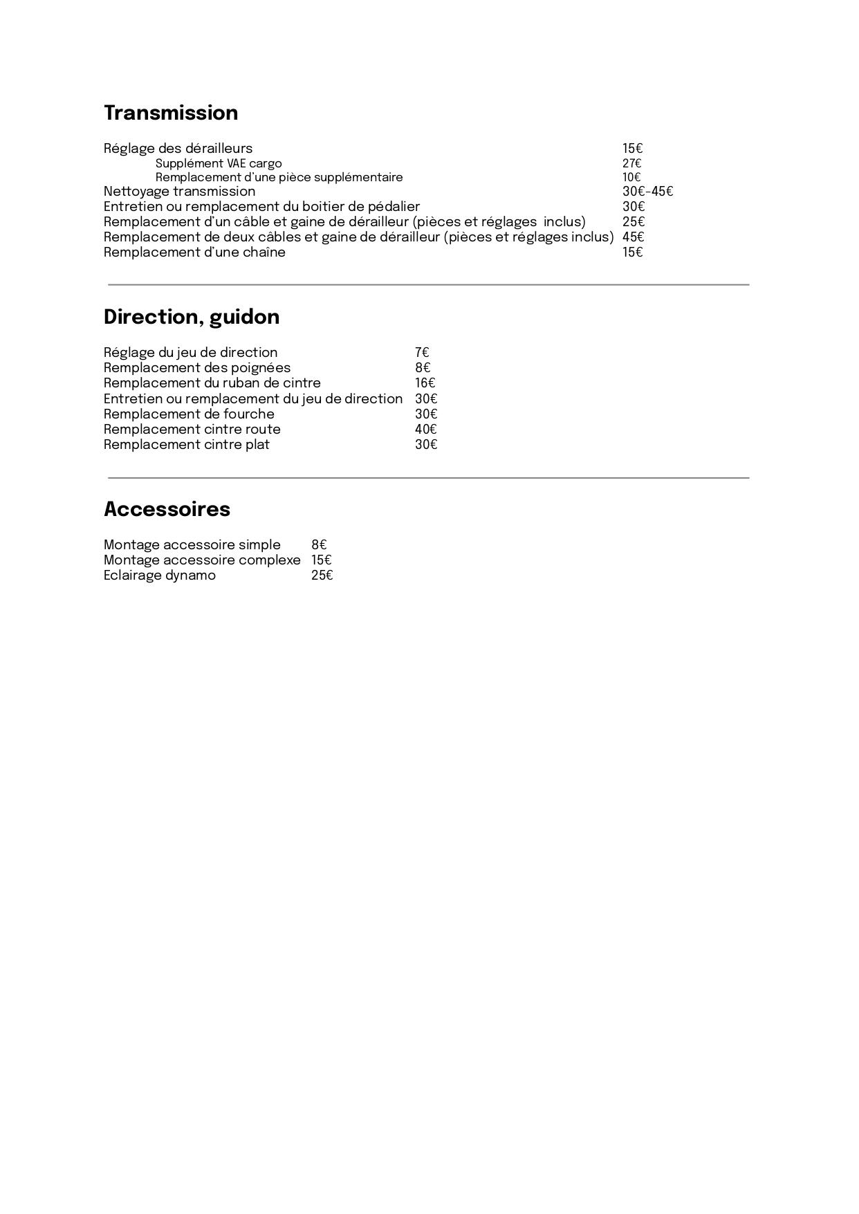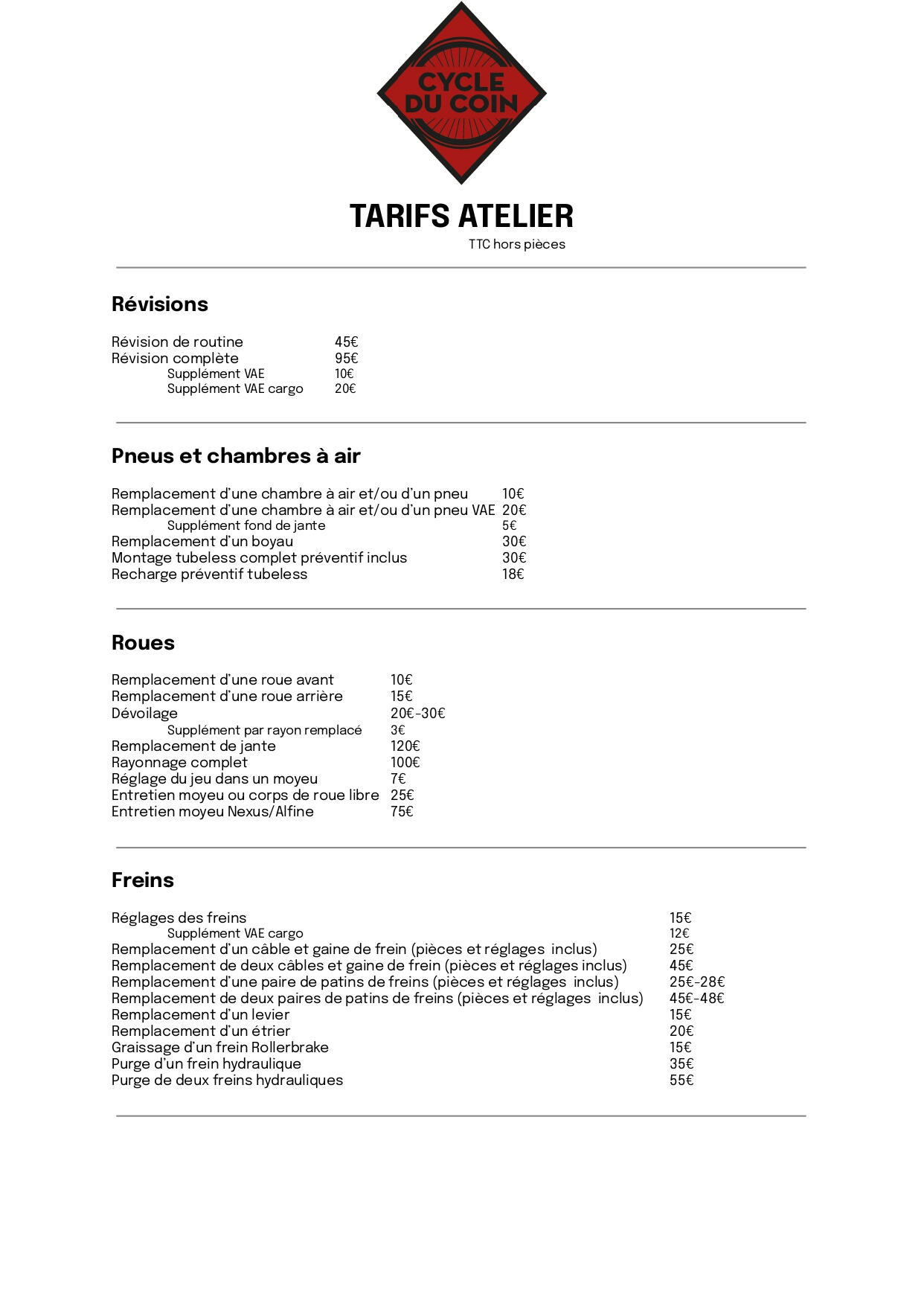 De la crevaison à la remise en état complète ou la transformation de votre vélo, nous réalisons tout type d’opération sur votre vélo ou vélo à assistance électrique.Vous trouverez ci-dessous la grille tarifaire de l’atelier. Les tarifs sont donnés à titre indicatif pour des prestations habituelles, hors pièces.Nous nous adaptons aux besoins et budgets de chacun, un devis vous sera proposé avant réparation.
